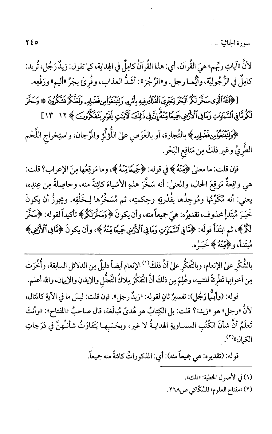 فإن قلت: ما معنى {مِنْهُ} في قوله: {جَمِيعًا مِنْهُ}، وما موقعها من الإعراب؟ قلت: هي واقعة موقع الحال، والمعنى: أنه سخر هذه الأشياء كائنة منه، وحاصلة من عنده، يعني: أنه مكوّنها وموجدها بقدرته وحكمته، ثم مسخرها لخلقه. ويجوز أن يكون خبر مبتدأ محذوف، تقديره: هي جميعًا منه، وأن يكون {وَسَخَّرَ لَكُمْ} تأكيدًا لقوله: {سَخَّرَ لَكُمْ}، ثم ابتدئ قوله: {ما فِي السَّماواتِ وَما فِي الْأَرْضِ جَمِيعًا مِنْهُ}، وأن يكون {ما فِي الْأَرْضِ} مبتدأ، و {مِنْهُ} خبره.