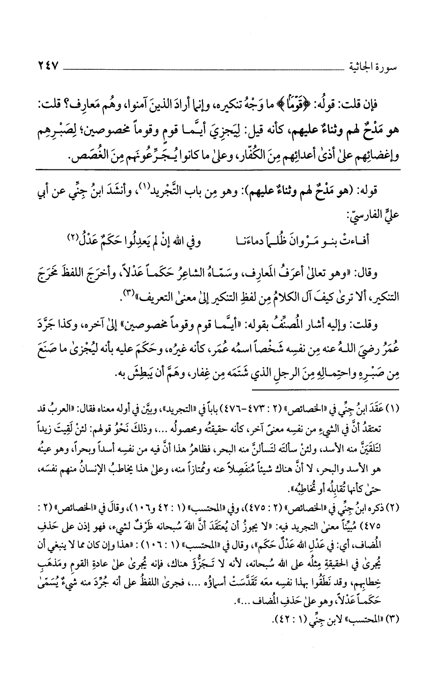 وقال: "وهو تعالى أعرف المعارف، وسماه الشاعر حكمًا عدلًا، وأخرج اللفظ مخرج التنكير، ألا ترى كيف آل الكلام من لفظ التنكير إلى معنى التعريف".