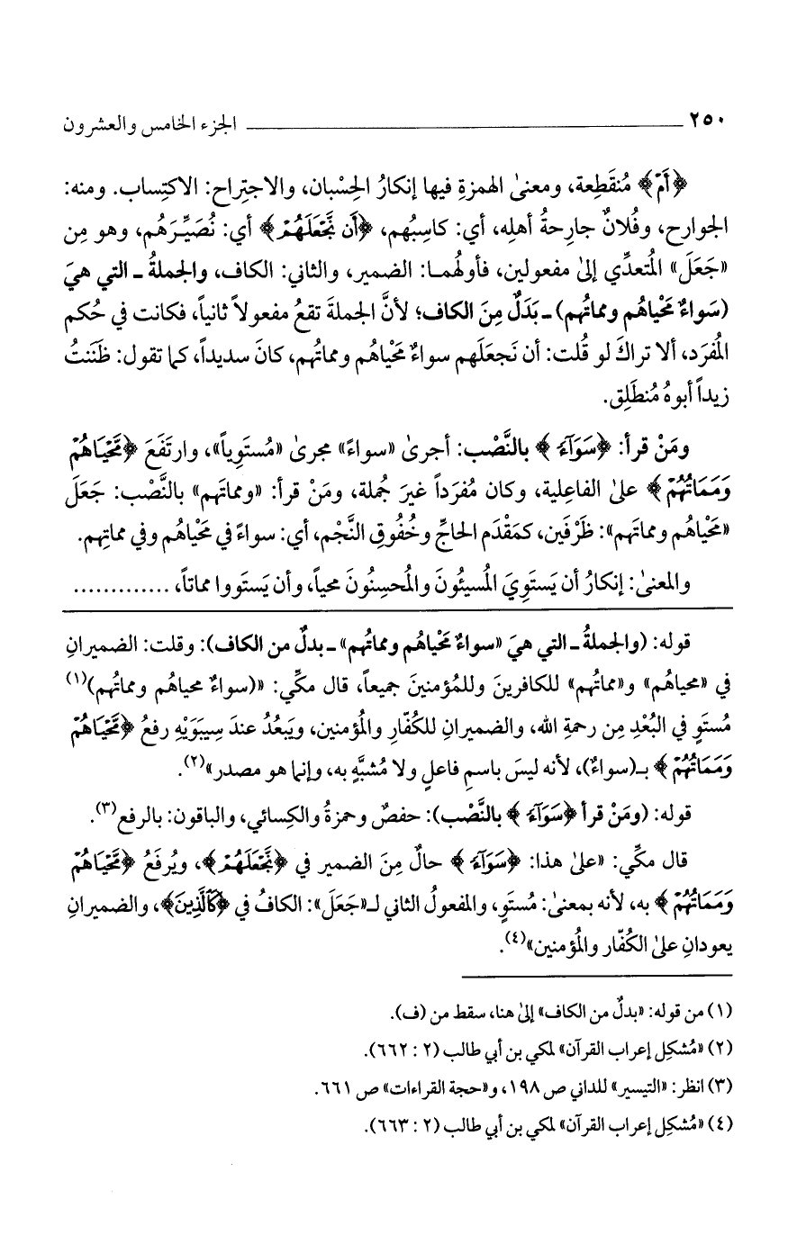 قوله: (والجملة - التي هي "سواء محياهم ومماتهم"- بدل من الكاف): وقلت: الضميران في "محياهم" و "مماتهم" للكافرين وللمؤمنين جميعًا، قال مكي: " (سواء محياهم ومماتهم) مستو في البعد من رحمة الله، والضميران للكفار والمؤمنين، ويبعد عند سيبويه رفع {مَّحْيَاهُمْ ومَمَاتُهُمْ} بـ (سواء)، لأنه ليس باسم فاعل ولا مشبه به، وإنما هو مصدر".