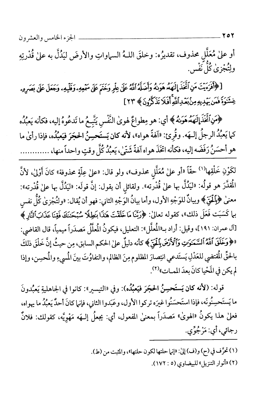 لكون خلقها حقًا "أو على معلل محذوف"، ولو قال: "على علة محذوفة" كان أولى، لأن المقدر هو قوله: "ليدل بها على قدرته". ولقائل أن قوله: "ليدل بها على قدرته": معنى {بِالْحَقِّ} وبيان للوجه الأول، وأما بيان الوجه الثاني: فهو أن يقال: "ولتجزى كل نفس بما كسبت فعل ذلك"، كقوله تعالى: {رَبَّنَا مَا خَلَقْتَ هَذَا بَاطِلًا سُبْحَانَكَ فَقِنَا عَذَابَ النَّارِ} [آل عمران: 191]، وقيل: أراد بـ"المعلل": التعليل، فيكون المعلل مصدرًا ميميًا، قال القاضي: " {وخَلَقَ اللَّهُ السَّمَوَاتِ والأَرْضَ بِالْحَقِّ} كأنه دليل على الحكم السابق، من حيث أن خلق ذلك بالحق المقتضي للعدل يستدعي انتصار المظلوم من الظالم، والتفاوت بين المسيء والمحسن، وإذا لم يكن في المحيا كان بعد الممات".