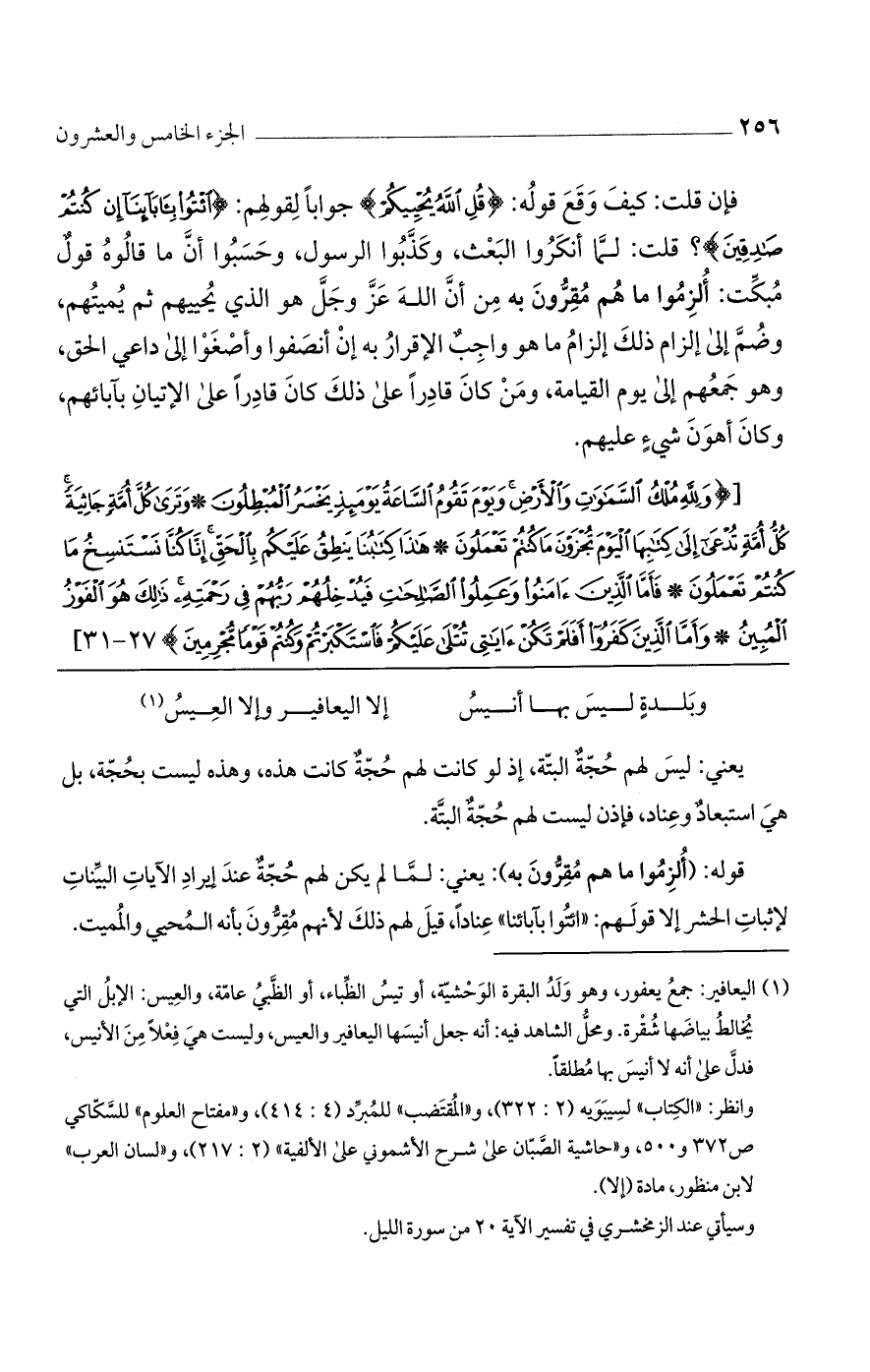 فإن قلت: كيف وقع قوله: {قُلِ اللَّهُ يُحْيِيكُمْ} جوابًا لقولهم: {ائْتُوا بِآبائِنا إِنْ كُنْتُمْ صادِقِينَ}؟ قلت: لما أنكروا البعث، وكذبوا الرسل، وحسبوا أنّ ما قالوه قول مبكت: ألزموا ما هو مقرّون به من أنّ الله عز وجل هو الذي يحييهم ثم يميتهم، وضم إلى إلزام ذلك إلزام ما هو واجب الإقرار به إن أنصفوا وأصغوا إلى داعى الحق، وهو جمعهم إلى يوم القيامة، ومن كان قادرًا على ذلك كان قادرُا على الإتيان بآبائهم، وكان أهون شيء عليه.