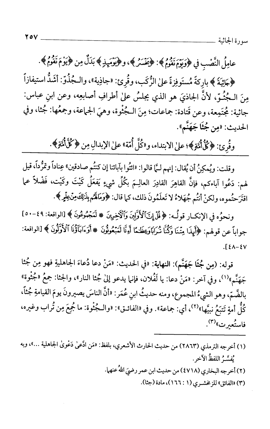 {جاثِيَةً} باركة مستوفزة على الركب، وقرئ: "جاذية"، والجذوّ: أشد استيفازًا من الجثوّ، لأن الجاذي هو الذي يجلس على أطراف أصابعه، وعن ابن عباس: جاثية: مجتمعة، وعن قتادة: جماعات؛ من الجثوة، وهي الجماعة، وجمعها: جثا، وفي الحديث: «من جثا جهنم».
