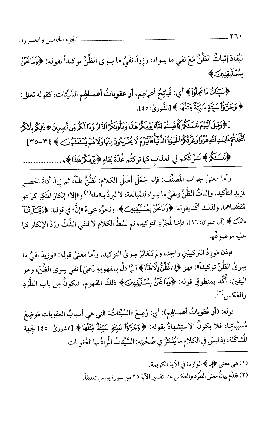 فإذن مورد التركيبين واحد، ولم يتغاير سوى التوكيد، وأما معنى قوله: "وزيد نفي ما سوى الظن توكيدًا": فهو {إن نَّظُنُّ إلاَّ ظَنًا} لما دل بمفهومه [على] نفي سوى الظن، وهو اليقين، أكد بمنطوق قوله: {ومَا نَحْنُ بِمُسْتَيْقِنِينَ} ذلك المفهوم، فيكون من باب الطرد والعكس.