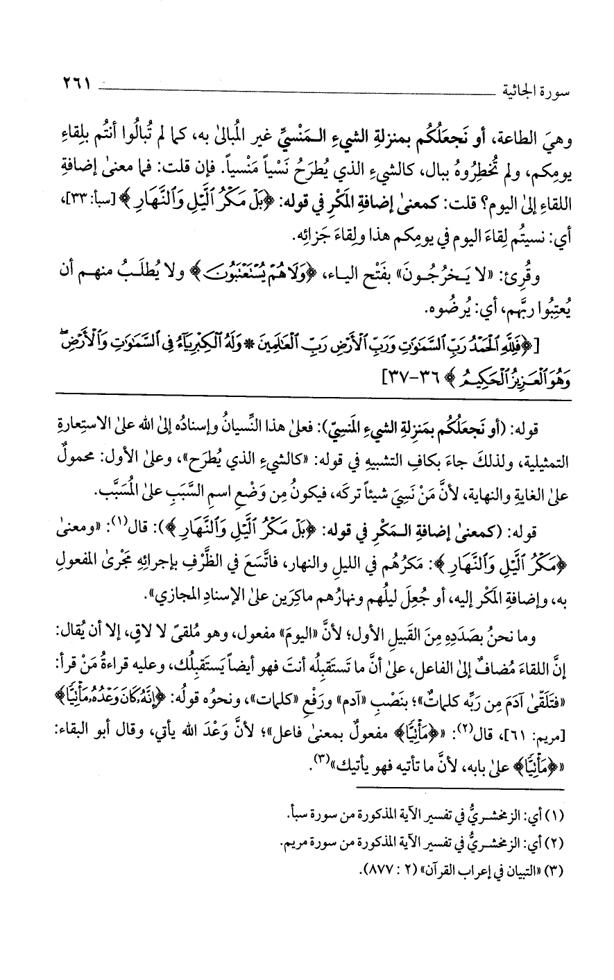 قوله: (كمعنى إضافة المكر في قوله: {بَلْ مَكْرُ اللَّيْلِ وَالنَّهَارِ}): قال: "ومعنى {مَكْرُ اللَّيْلِ وَالنَّهَارِ}: مكرهم في الليل والنهار، فاتسع في الظرف بإجرائه مجرى المفعول به، وإضافة المكر إليه، أو جعل ليلهم ونهارهم ماكرين على الإسناد المجازي".