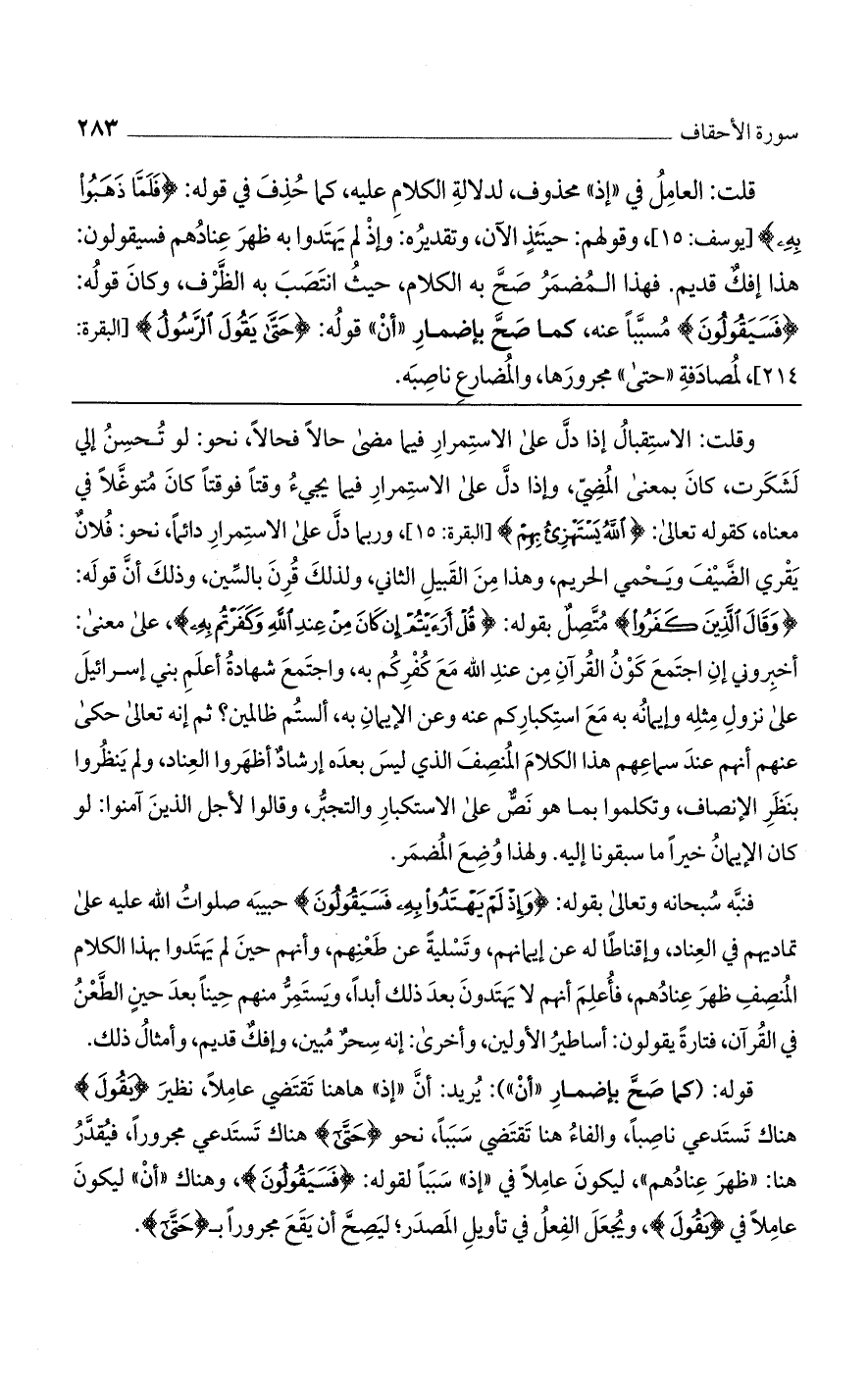 قلت: العامل في "إذ" محذوف، لدلالة الكلام عليه، كما حذف من قوله: {فَلَمَّا ذَهَبُوا بِهِ} [يوسف: 15]، وقولهم: حينئذ الآن، وتقديره: وإذ لم يهتدوا به ظهر عنادهم فسيقولون: هذا إفك قديم. فهذا المضمر صحّ به الكلام، حيث انتصب به الظرف، وكان قوله: {فَسَيَقُولُونَ} مسببًا عنه، كما صحّ بإضمار "أنّ" قوله: {حَتَّى يَقُولَ الرَّسُولُ} [البقرة: 214]، لمصادفة "حَتَّى" مجرورها، والمضارع ناصبه.