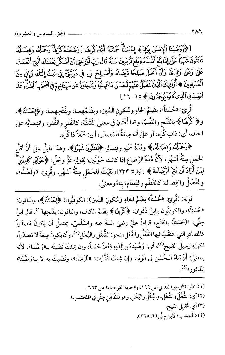 قوله: (قرئ: "حسنًا" بضم الحاء وسكون السين): الكوفيون: {إحْسَانًا}، والباقون: "حسنًا"، والكوفيون وابن ذكوان: {كُرْهًا} بضم الكاف، والباقون: بفتحها. قال ابن جني: " (حسنًا) بالفتح، قراءة علي رضي الله عنه والسلمي، يحتمل أن يكون مصدرًا كالمصادر التي اعتقب فيها الفعل، نحو: الشغل والبخل، وأن يكون صفةً لا مصدرًا، لكونه رسيل القبيح، أي: وصيناه بوالديه فعلًا حسنًا، وإن شئت نصبته بـ"وصينا"، لأنه بمعنى: ألزمناه الحسن في أبويه، وإن شئت قدرت: "ألزمناه"، ونصبت به لا بـ"وصينا" المذكور".