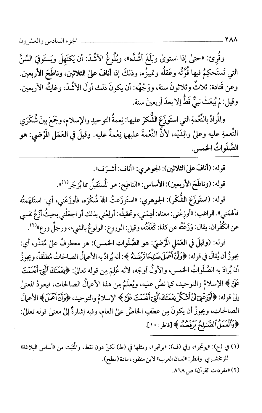 والمراد بالنعمة التي استوزع الشكر عليها: نعمة التوحيد والإسلام، وجمع بين شكري النعمة عليه وعلى والديه، لأن النعمة عليهما نعمة عليه. وقيل في العمل المرضي: هو الصلوات الخمس.