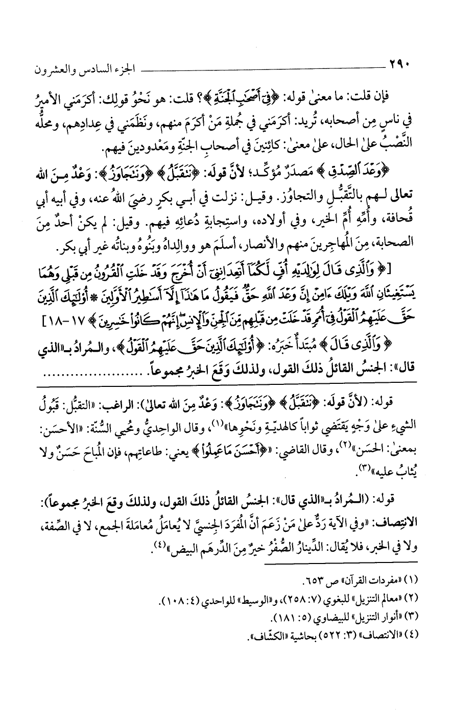 قوله: (لأن قوله: {نَتَقَبَّلُ} {ونَتَجَاوَزُ}: وعد من الله تعالى): الراغب: "التقبل: قبول الشيء على وجه يقتضي ثوابًا كالهدية ونحوها"، وقال الواحدي ومحيي السنة: "الأحسن: بمعنى: الحسن"، وقال القاضي: " {أَحْسَنَ مَا عَمِلُوا} يعني: طاعاتهم، فإن المباح حسن ولا يثاب عليه".