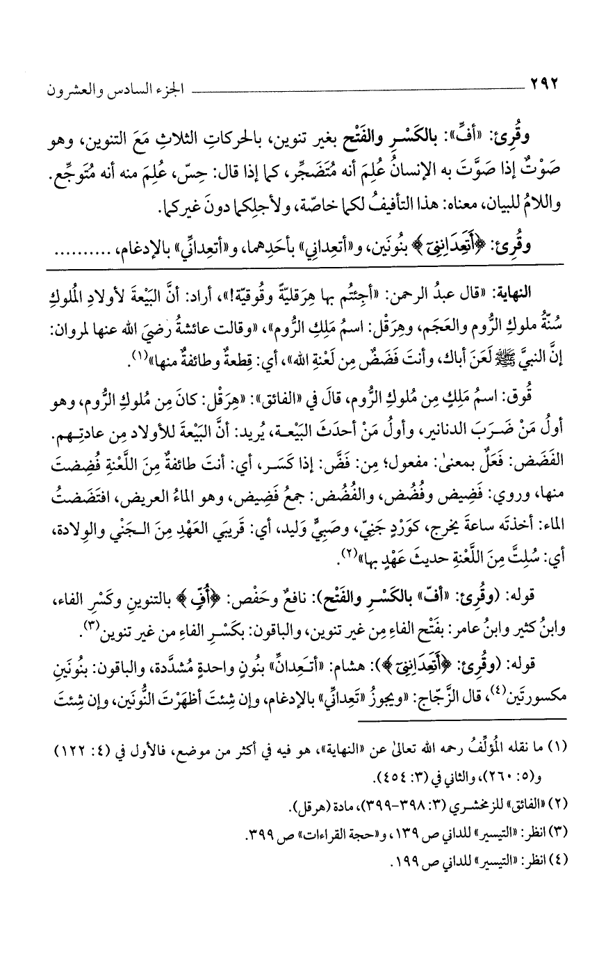 قوله: (وقرئ: {أَتَعِدَانِنِي}): هشام: "أتعدان" بنون واحدة مشددة، والباقون: بنونين مكسورتين، قال الزجاج: "ويجوز تعداني" بالإدغام، وإن شئت أظهرت النونين، وإن شئت