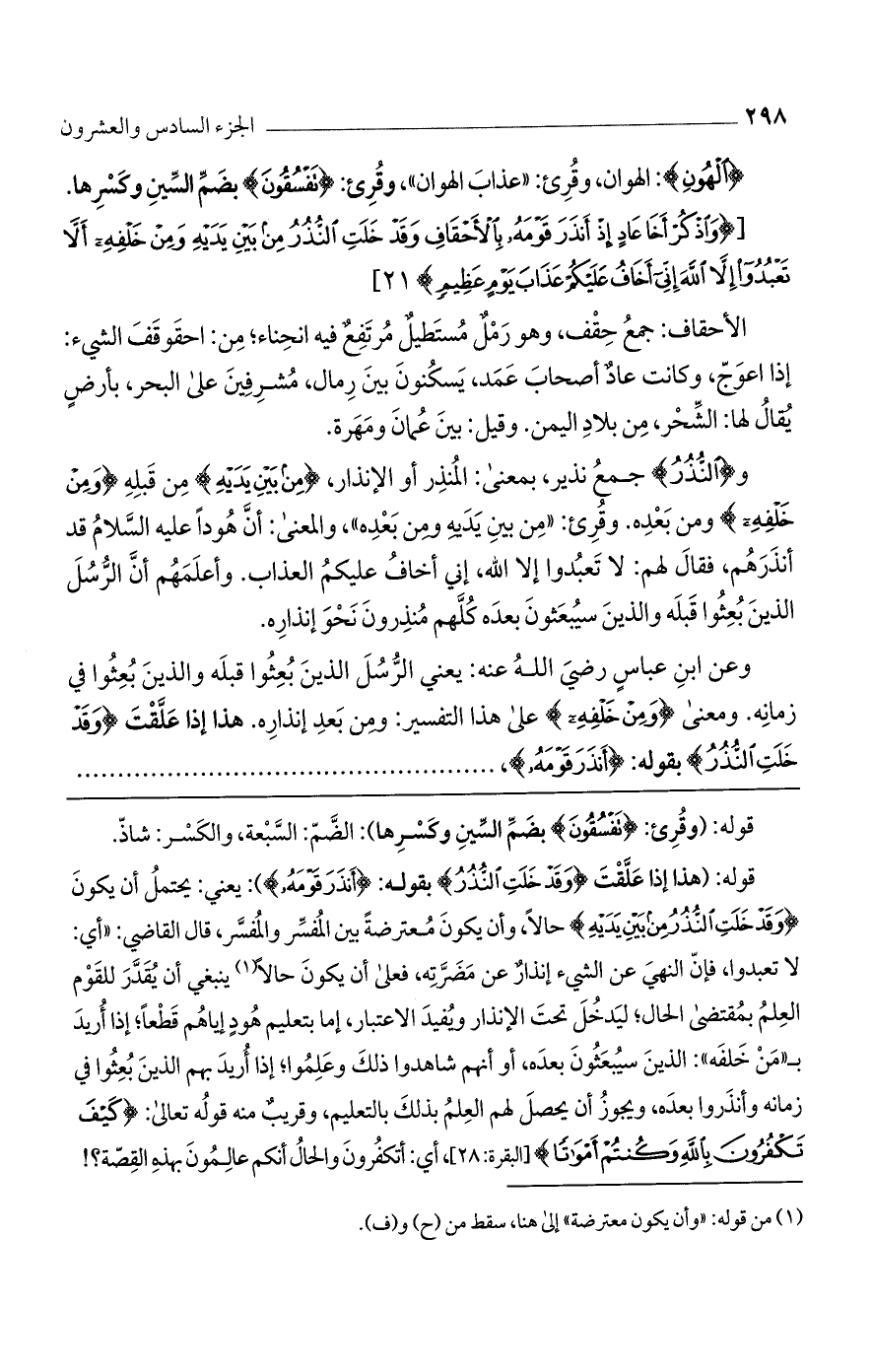 [{وَاذْكُرْ أَخا عادٍ إِذْ أَنْذَرَ قَوْمَهُ بِالْأَحْقافِ وَقَدْ خَلَتِ النُّذُرُ مِنْ بَيْنِ يَدَيْهِ وَمِنْ خَلْفِهِ أَلاَّ تَعْبُدُوا إِلاَّ اللَّهَ إِنِّي أَخافُ عَلَيْكُمْ عَذابَ يَوْمٍ عَظِيمٍ} 21]