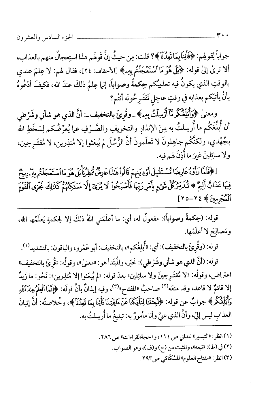 قوله: (أن الذي هو شأني وشرطي): خبر، والمبتدأ هو: "معنى"، وقوله: "قرئ بالتخفيف" اعتراض، وقوله: "لا مقترحين ولا سائلين" بعد قوله: "لم يبعثوا إلا منذرين": نحو: ما زيد إلا قائم لا قاعد، وقد منعه صاحب "المفتاح"، وفيه إيذان بأن قوله: {إنَّمَا العِلْمُ عِندَ اللَّهِ وأُبَلِّغُكُم} جواب عن قوله: {أَجِئْتَنَا لِتَافِكَنَا عَنْ آلِهَتِنَا فَاتِنَا بِمَا تَعِدُنَا}، وخلاصته: أن إتيان العذاب ليس إلي، وأن الذي علي وأنا مأمور به: تبليغ ما أرسلت به.