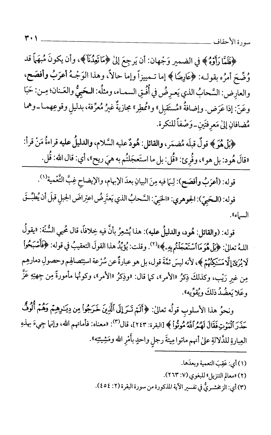 {فَلَمَّا رَأَوْهُ} في الضمير وجهان: أن يرجع إلى {مَا تَعِدُنَا}، وأن يكون مبهمًا قد وضح أمره بقوله: {عَارِضًا} إما تمييزًا وإما حالًا، وهذا الوجه أعرب وأفصح، والعارض: السحاب الذي يعرض في أفق السماء، ومثله: الحبي والعنان؛ من حبا وعنّ: إذا عرض. وإضافة "مستقبل" و"ممطر" مجازية غير معرفة، بدليل وقوعهما -وهما مضافان إلى معرفتين- وصفًا للنكرة.