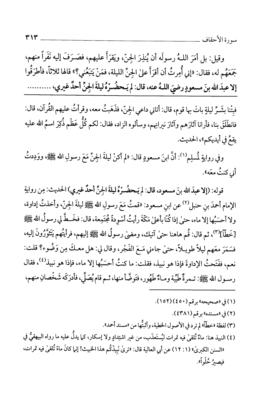 قوله: (إلا عبد الله بن مسعود، قال: لم يحضره ليلة الجن أحد غيري) الحديث: من رواية الإمام أحمد بن حنبل عن ابن مسعود: "قمت مع رسول الله صلى الله عليه وسلم ليلة الجن، وأخذت إداوة، ولا أحسبها إلا ماء، حتى إذا كنا بأعلى مكة رأيت أسودةً مجتمعة، قال: فخط لي رسول الله صلى الله عليه وسلم [خطأ]، ثم قال: قم هاهنا حتى آتيك، ومضى رسول الله صلى الله عليه وسلم إليهم، فرأيتهم يتثورون إليه، فسمر معهم ليلًا طويلًا، حتى جاءني مع الفجر، وقال لي: هل معك من وضوء؟ قلت: نعم، ففتحت الإداوة فإذا هو نبيذ، فقلت: ما كنت أحسبها إلا ماء، فإذا هو نبيذ، فقال رسول الله صلى الله عليه وسلم: تمرة طيبة وماء طهور، فتوضأ منها، ثم قام يصلي، فأدركه شخصان منهم.
