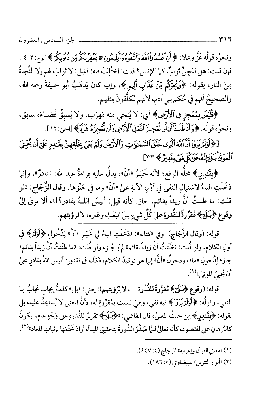 قوله: (وقال الزجاج): وفي "كتابه": "دخلت الباء في خبر "أن" لدخول {أَوَ لَمْ} في أول الكلام، ولو قلت: "ظننت أن زيدًا بقائم" لم يجز، ولو قلت: "ما ظننت أن زيدًا بقائم" جاز؛ لدخول "ما"، ودخول "أن" إنما هو توكيد الكلام، فكأنه في تقديره: أليس الله بقادر على أن يحيي الموتى".