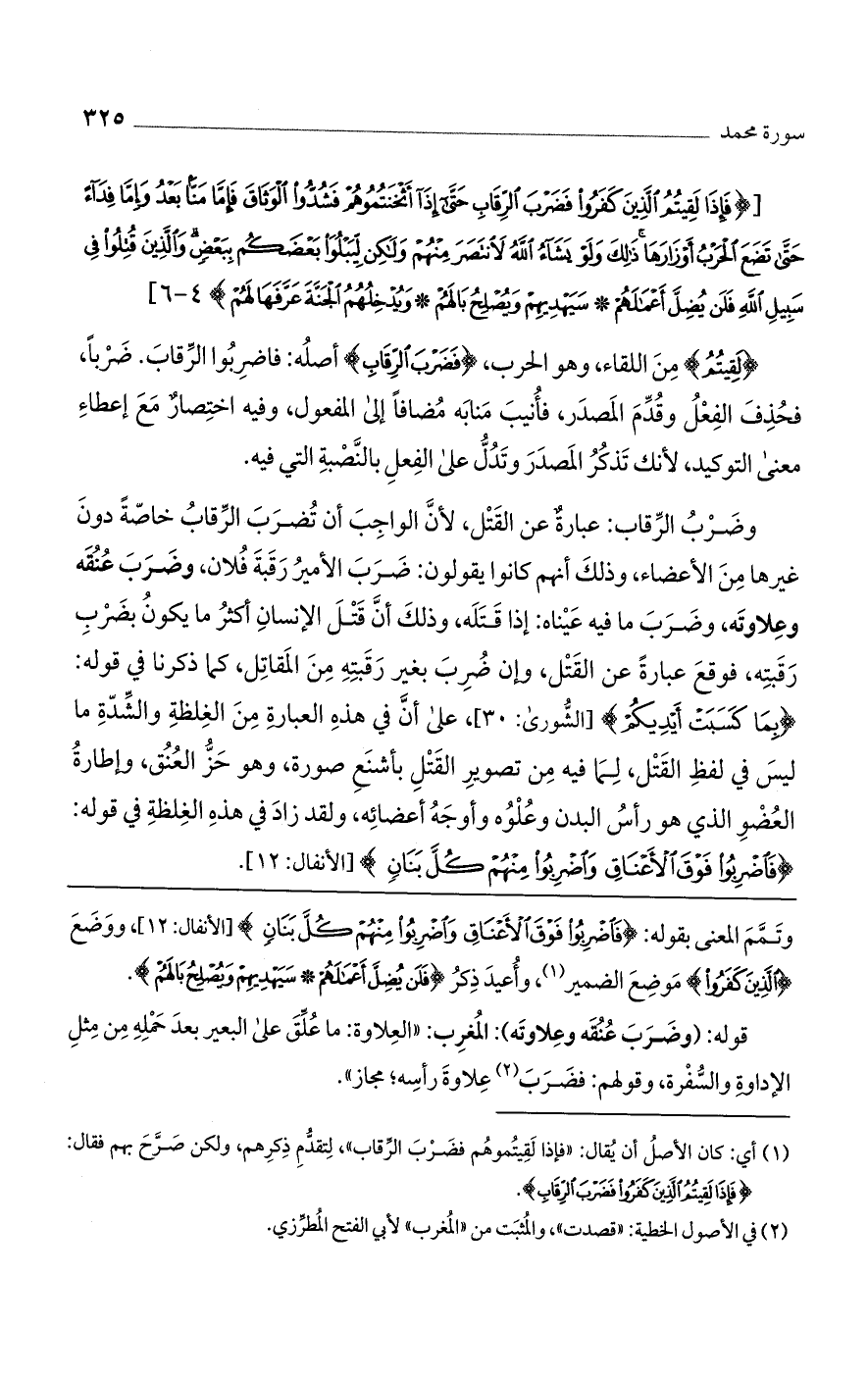 {لَقِيتُمُ} من اللقاء، وهو الحرب، {فَضَرْبَ الرِّقابِ} أصله: فاضربوا الرقاب. ضربًا، فحذف الفعل وقدّم المصدر، فأنيب منابه مضافًا إلى المفعول، وفيه اختصار مع إعطاء معنى التوكيد، لأنك تذكر المصدر وتدل على الفعل بالنصبة التي فيه.