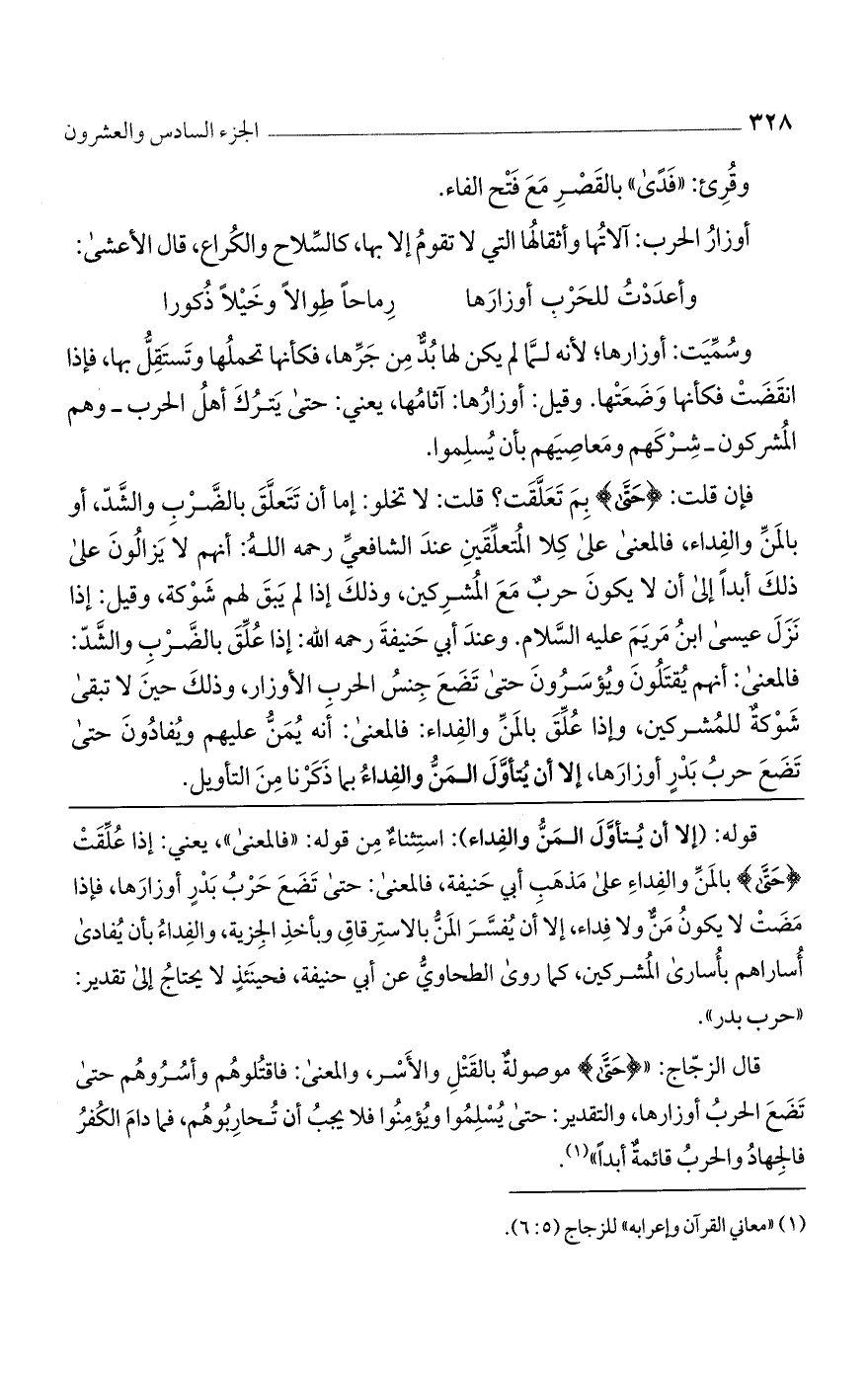 وسميت: أوزارها؛ لأنه لما لم يكن لها بد من جرّها، فكأنها تحملها وتستقل بها، فإذا انقضت فكأنها وضعتها. وقيل: أوزارها: آثامها، يعني: حتى يترك أهل الحرب- وهم المشركون- شركهم ومعاصيهم بأن يسلموا.