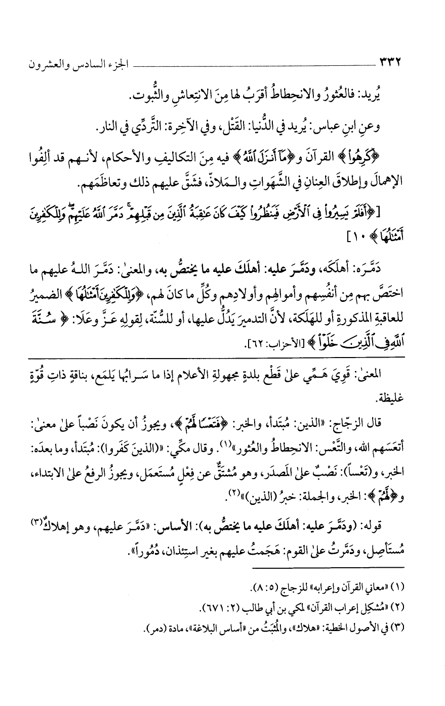 دمره: أهلكه، ودمر عليه: أهلك عليه ما يختص به، والمعنى: دمر الله عليهم ما اختص بهم من أنفسهم وأموالهم وأولادهم وكل ما كان لهم، {وَلِلْكافِرِينَ أَمْثالُها} الضمير للعاقبة المذكورة أو للهلكة، لأن التدمير يدل عليها، أو للسنة، لقوله عزّ وعلا: {سُنَّةَ اللَّهِ فِي الَّذِينَ خَلَوْا} [الأحزاب: 62].