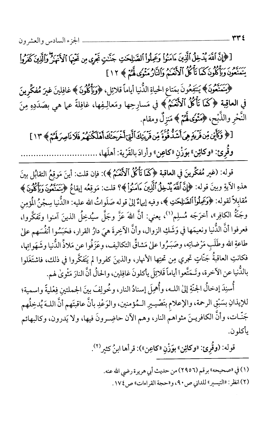 [{إِنَّ اللَّهَ يُدْخِلُ الَّذِينَ آمَنُوا وَعَمِلُوا الصَّالِحاتِ جَنَّاتٍ تَجْرِي مِنْ تَحْتِهَا الْأَنْهارُ وَالَّذِينَ كَفَرُوا يَتَمَتَّعُونَ وَيَاكُلُونَ كَما تَاكُلُ الْأَنْعامُ وَالنَّارُ مَثْوىً لَهُمْ} 12]