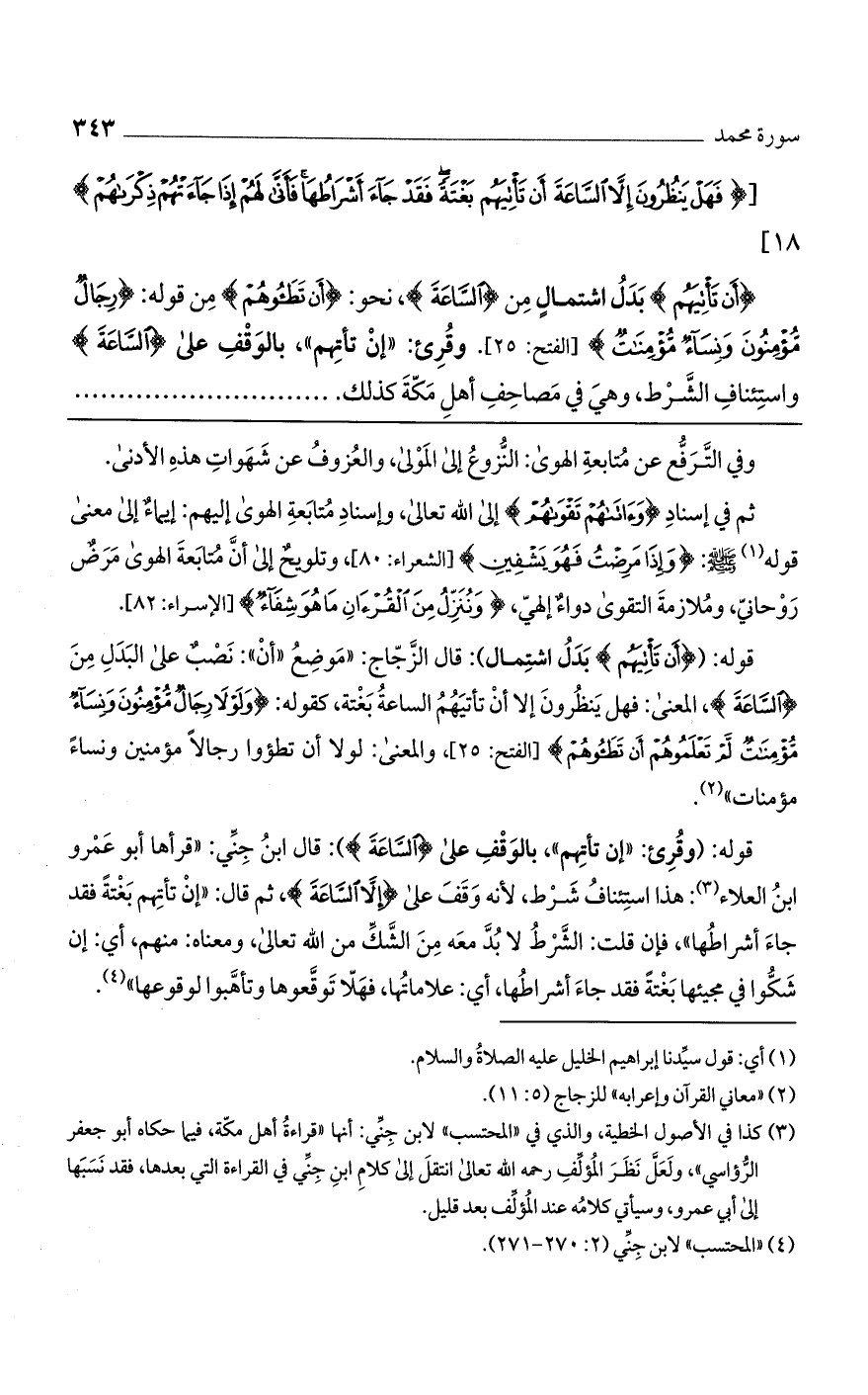 قوله: (وقرئ: "إن تأتهم"، بالوقف على {السَّاعَةَ}): قال ابن جني: "قرأها أبو عمرو ابن العلاء: هذا استئناف شرط، لأنه وقف على {إِلَّا السَّاعَةَ}، ثم قال: "إن تأتهم بغتةً فقد جاء أشراطها"، فإن قلت: الشرط لا بد معه من الشك من الله تعالى، ومعناه: منهم، أي: أن شكوا في مجيئها بغتةً فقد جاء أشراطها، أي: علاماتها، فهلا توقعوها وتأهبوا لوقوعها".