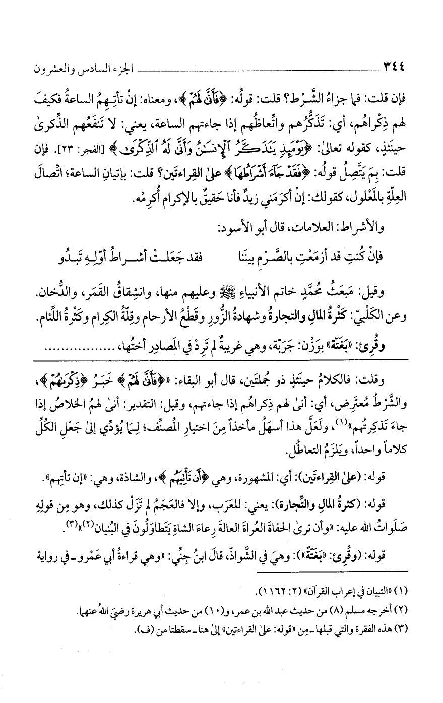 فإن قلت: فما جزاء الشرط؟ قلت: قوله: {فَأَنَّى لَهُمْ}، ومعناه: إن تأتهم الساعة فكيف لهم ذكراهم، أي: تذكرهم واتعاظهم إذا جاءتهم الساعة، يعني: لا تنفعهم الذكرى حينئذ، كقوله تعالى: {يَوْمَئِذٍ يَتَذَكَّرُ الْإِنْسانُ وَأَنَّى لَهُ الذِّكْرى} [الفجر: 23]. فإن قلت: بم يتصل قوله: {فَقَدْ جاءَ أَشْراطُها} على القراءتين؟ قلت: بإتيان الساعة؛ اتصال العلة بالمعلول، كقولك: إن أكرمني زيد فأنا حقيق بالإكرام أكرمه.