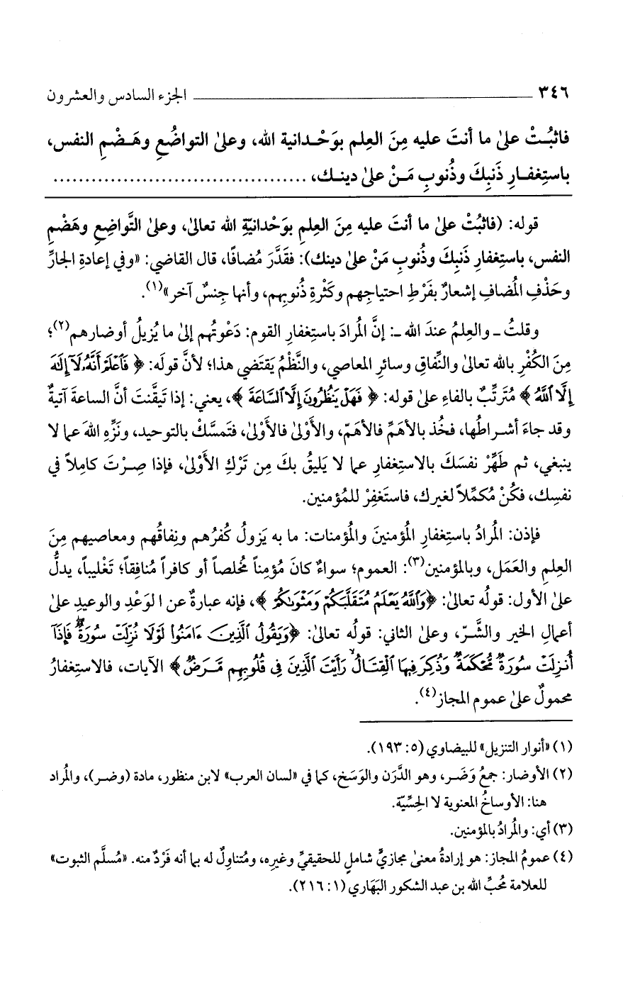 قوله: (فاثبت على ما أنت عليه من العلم بوحدانية الله تعالى، وعلى التواضع وهضم النفس، باستغفار ذنبك وذنوب من على دينك): فقدر مضافًا، قال القاضي: "وفي إعادة الجار وحذف المضاف إشعار بفرط احتياجهم وكثرة ذنوبهم، وأنها جنس آخر".