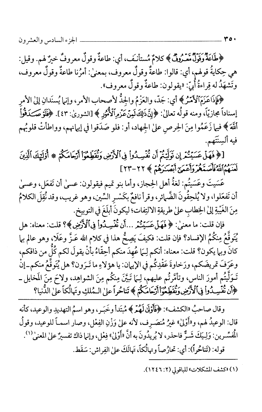 فإن قلت: ما معنى: {فَهَلْ عَسَيْتُمْ ... أَنْ تُفْسِدُوا فِي الْأَرْضِ}؟ قلت: معناه: هل يتوقع منكم الإفساد؟ فإن قلت: فكيف يصح هذا في كلام الله عز وعلا، وهو عالم بما كان وما يكون؟ قلت: معناه: أنكم لما عهد منكم أحقاء بأن يقول لكم كل من ذاقكم، وعرف تمريضكم، ورخاوة عقدكم في الإيمان: يا هؤلاء ما ترون؟ هل يتوقع منكم -إن توليتم أمور الناس، وتأمرتم عليهم، لما تبين منكم من الشواهد، ولاح من المخايل- {أَنْ تُفْسِدُوا فِي الْأَرْضِ وَتُقَطِّعُوا أَرْحامَكُمْ} تناحرًا على الملك وتهالكًا على الدنيا؟