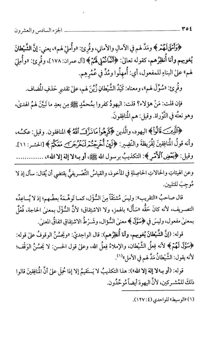 قوله: (إن الشيطان يغويهم، وأنا أنظرهم): قال الواحدي: "ويحسن الوقوف على قوله: {سَوَّلَ لَهُمْ} لأنه فعل الشيطان، والإملاء فعل الله، وعلى قول الحسن: لا يحسن الوقف؛ لأنه يقول: الشيطان مد لهم في الأمل".