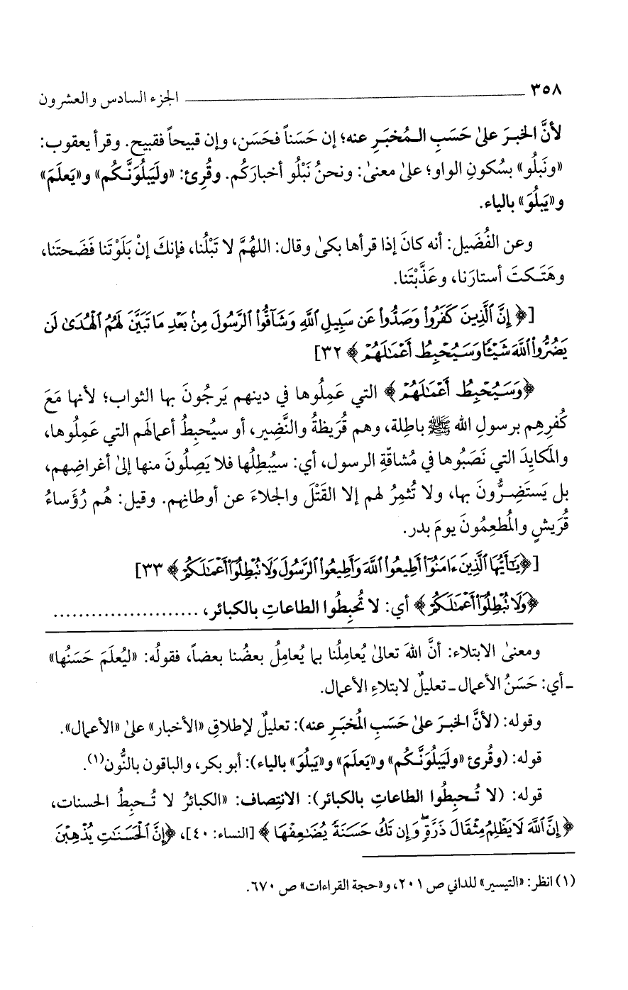 قوله: (لا تحبطوا الطاعات بالكبائر): الانتصاف: "الكبائر لا تحبط الحسنات، {إِنَّ اللَّهَ لَا يَظْلِمُ مِثْقَالَ ذَرَّةٍ وَإِنْ تَكُ حَسَنَةً يُضَاعِفْهَا} [النساء: 40]، {إِنَّ الْحَسَنَاتِ يُذْهِبْنَ