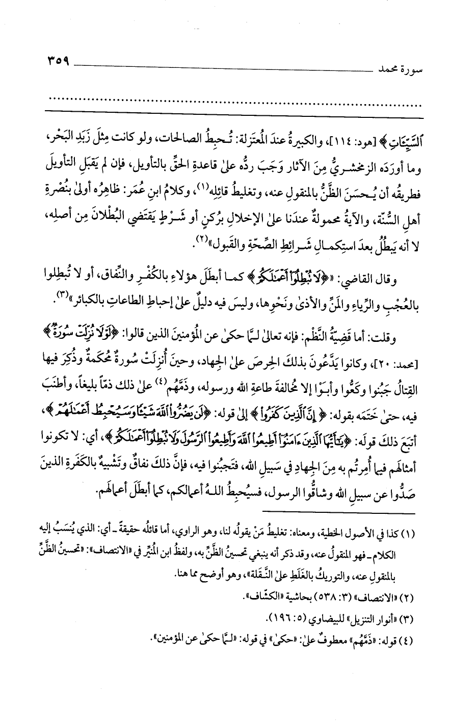 السَّيِّئَاتِ} [هود: 114]، والكبيرة عند المعتزلة: تحبط الصالحات، ولو كانت مثل زبد البحر، وما أورده الزمخشري من الآثار وجب رده على قاعدة الحق بالتأويل، فإن لم يقبل التأويل فطريقه أن يحسن الظن بالمنقول عنه، وتغليط قائله، وكلام ابن عمر: ظاهره أولى بنصرة أهل السنة، والآية محمولة عندنا على الإخلال بركن أو شرط يقتضي البطلان من أصله، لا أنه يبطل بعد استكمال شرائط الصحة والقبول".