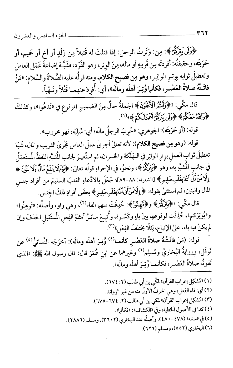 {وَلَنْ يَتِرَكُمْ}: من: وترت الرجل: إذا قتلت له قتيلًا من ولد أو أخ أو حميم، أو حربته، وحقيقته: أفردته من قريبه أو ماله، من الوتر، وهو الفرد، فشبه إضاعة عمل العامل وتعطيل ثوابه بوتر الواتر، وهو من فصيح الكلام، ومنه قوله عليه الصلاة والسلام: «من فاتته صلاة العصر، فكأنما وتر أهله وماله»، أي: أفرد عنهما قتلًا ونهبًا.