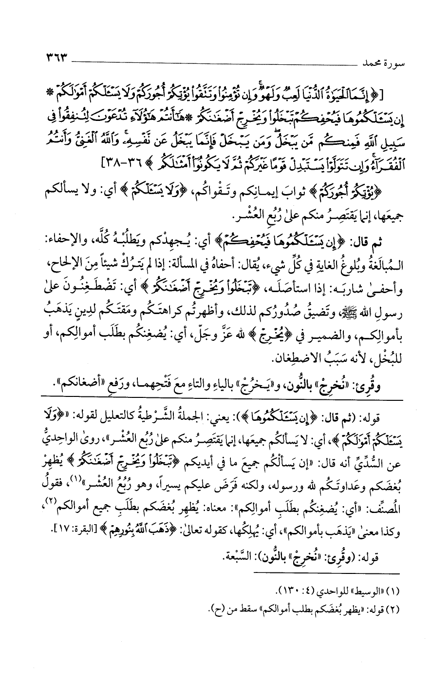 [{إِنَّمَا الْحَياةُ الدُّنْيا لَعِبٌ وَلَهْوٌ وَإِنْ تُؤْمِنُوا وَتَتَّقُوا يُؤْتِكُمْ أُجُورَكُمْ وَلا يَسْئَلْكُمْ أَمْوالَكُمْ * إِنْ يَسْئَلْكُمُوها فَيُحْفِكُمْ تَبْخَلُوا وَيُخْرِجْ أَضْغانَكُمْ * ها أَنْتُمْ هؤُلاءِ تُدْعَوْنَ لِتُنْفِقُوا فِي سَبِيلِ اللَّهِ فَمِنْكُمْ مَنْ يَبْخَلُ وَمَنْ يَبْخَلْ فَإِنَّما يَبْخَلُ عَنْ نَفْسِهِ وَاللَّهُ الْغَنِيُّ وَأَنْتُمُ الْفُقَراءُ وَإِنْ تَتَوَلَّوْا يَسْتَبْدِلْ قَوْمًا غَيْرَكُمْ ثُمَّ لا يَكُونُوا أَمْثالَكُمْ} [36 - 38]