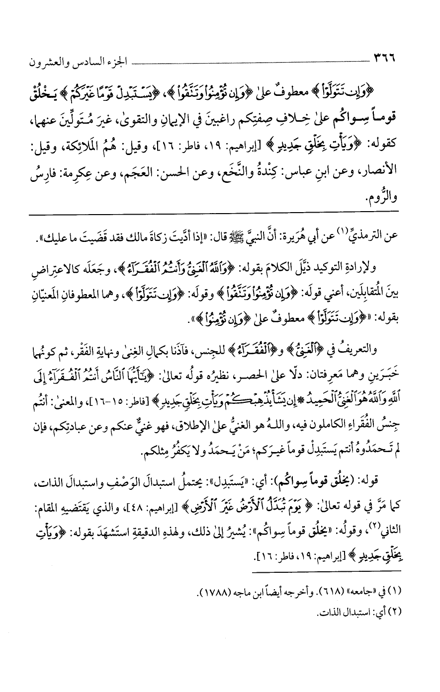 ولإرادة التوكيد ذيل الكلام بقوله: {واللَّهُ الغَنِيُّ وأَنتُمُ الفُقَرَاءُ}، وجعله كالاعتراض بين المتقابلين، أعني قوله: {وإن تُؤْمِنُوا وتَتَّقُوا} وقوله: {وإن تَتَوَلَّوْا}، وهما المعطوفان المعنيان بقوله: " {وإن تَتَوَلَّوْا} معطوف على {وإن تُؤْمِنُوا} ".