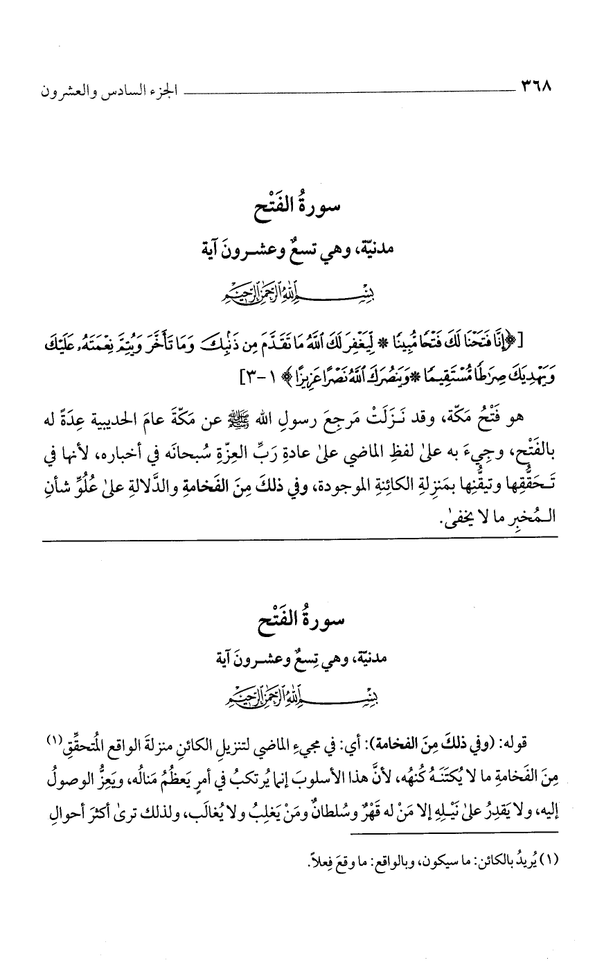 [{إِنَّا فَتَحْنا لَكَ فَتْحًا مُبِينًا * لِيَغْفِرَ لَكَ اللَّهُ ما تَقَدَّمَ مِنْ ذَنْبِكَ وَما تَأَخَّرَ وَيُتِمَّ نِعْمَتَهُ عَلَيْكَ وَيَهْدِيَكَ صِراطًا مُسْتَقِيمًا * وَيَنْصُرَكَ اللَّهُ نَصْرًا عَزِيزًا} 1 - 3]