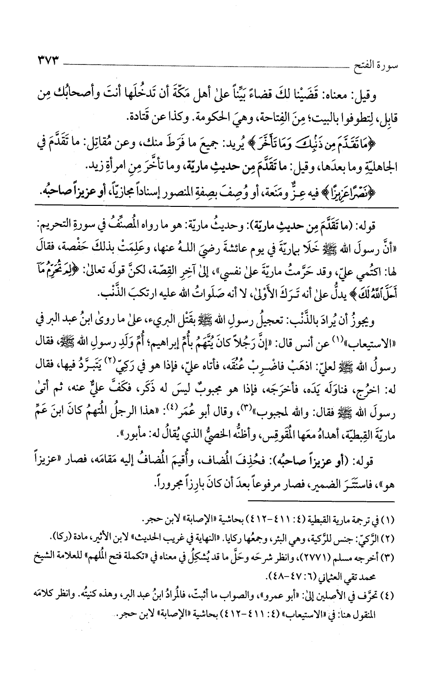ويجوز أن يراد بالذنب: تعجيل رسول الله صلى الله عليه وسلم بقتل البريء على ما روى ابن عبد البر في "الاستيعاب" عن أنس قال: "إن رجلًا كان يتهم بأم إبراهيم؛ أم ولد رسول الله صلى الله عليه وسلم، فقال رسول الله صلى الله عليه وسلم لعلي: اذهب فاضرب عنقه، فأتاه علي، فإذا هو في ركي يتبرد فيها، فقال له: اخرج، فناوله يده، فأخرجه، فإذا هو مجبوب ليس له ذكر، فكف علي عنه، ثم أتى رسول الله صلى الله عليه وسلم فقال: والله لمجبوب"، وقال أبو عمر: "هذا الرجل المتهم كان ابن عم مارية القبطية، أهداه معها المقوقس، وأظنه الخصي الذي يقال له: مأبور".
