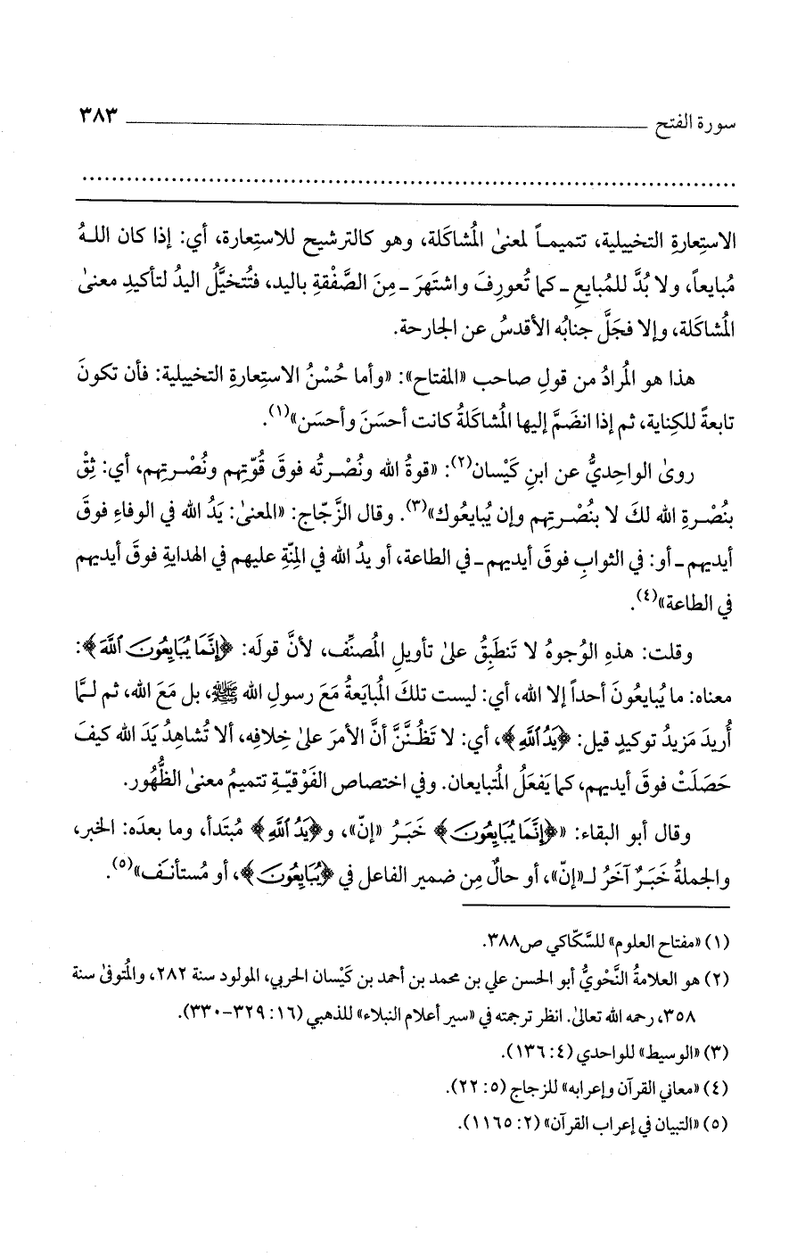 وقلت: هذه الوجوه لا تنطبق على تأويل المصنف، لأن قوله: {إنَّمَا يُبَايِعُونَ اللَّهَ}: معناه: ما يبايعون أحد إلا الله، أي: ليست تلك المبايعة مع رسول الله صلى الله عليه وسلم، بل مع الله، ثم لما أريد مزيد توكيد قيل: {يَدُ اللَّهِ}، أي: لا تظنن أن الأمر على خلافه، ألا تشاهد يد الله كيف حصلت فوق أيديهم، كما يفعل المتبايعان. وفي اختصاص الفوقية تتميم معنى الظهور.
