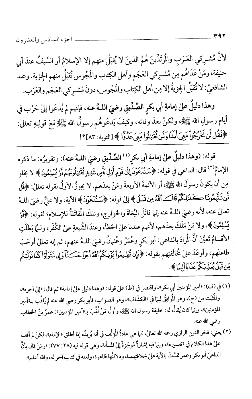 قوله: (وهذا دليل على إمامة أبي بكر الصديق رضي الله عنه): وتقريره: ما ذكره الإمام قال: الداعي في قوله: {سَتُدْعَوْنَ إلَى قَوْمٍ أُوْلِي بَاسٍ شَدِيدٍ تُقَاتِلُونَهُمْ أَوْ يُسْلِمُونَ} لا يخلو من أن يكون رسول الله صلى الله عليه وسلم، أو الأئمة الأربعة ومن بعدهم. لا يجوز الأول لقوله تعالى: {لَّن تَتَّبِعُونَا كَذَلِكُمْ قَالَ اللَّهُ مِن قَبْلُ} إلى قوله: {سَتُدْعَوْنَ} الآية، ولا علي رضي الله تعالى عنه، لأنه رضي الله عنه إنما قاتل البغاة والخوارج، وتلك المقاتلة للإسلام؛ ولما بطلت الأقسام تعين أن المراد بالداعي: أبو بكر وعمر وعثمان رضي الله عنهم، ثم إنه تعالى أوجب طاعتهم، وأوعد على مخالفتهم بقوله: {فَإن تُطِيعُوا يُؤْتِكُمُ اللَّهُ أَجْرًا حَسَنًا وإن تَتَوَلَّوْا كَمَا تَوَلَّيْتُم مِّن قَبْلُ يُعَذِّبْكُمْ عَذَابًا أَلِيمًا}.