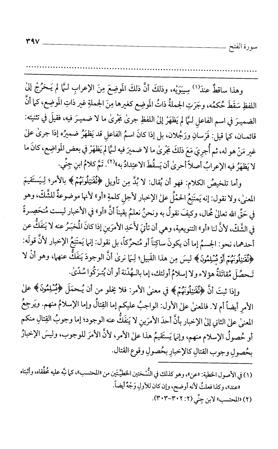 وإذا ثبت أن {تُقَاتِلُونَهُمْ} في معنى الأمر: فلا يخلو من أن يحمل {يُسْلِمُونَ} على الأمر أيضًا أم لا. فالمعنى على الأول: الواجب عليكم إما القتال وإما الإسلام منهم. ويرجع المعنى على الثاني إلى الإخبار بأن أحد الأمرين لا ينفك عنه الوجود؛ إما وجوب القتال منكم أو حصول الإسلام منهم، وإنما يستقيم هذا على الأمر، لأن الأمر للوجوب، وليس الإخبار بحصول وجوب القتال كالإخبار بحصول وقوع القتال.