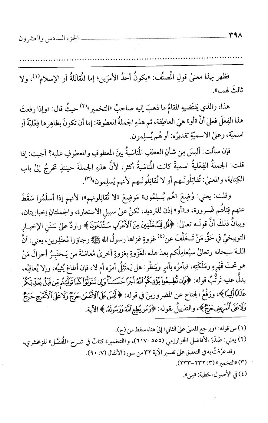 وقلت: يعني: وضع "هم يسلمون" موضع "لا تقلونلونهم"؛ لأنهم إذا أسلموا سقط عنهم قتالهم ضرورة، "أو" إذن للتريد، لكن على سبيل الاستعارة، والجملتان إخباريتان، وبيان ذلك أن قوله تعالى: {قُل لِّلْمُخَلَّفِينَ مِنَ الأَعْرَابِ سَتُدْعَوْنَ} وارد على سنن الإخبار التوبيخي في حق من تخلف عن غزوة غزاها رسول الله صلى الله عليه وسلم وجاؤوا معتذرين، يعني: أن الله سبحانه وتعالى سيعاملكم بعد هذه الغزوة بغزوة أخرى معاملة من يختبر أحوال من هو تحت قهره وملكته، فيأمره بأمر وينظر: هل يمتثل أمره أم لا، فإن أطاع يثيبه، وإلا يعاقبه، يدل عليه ترتب قوله: {فَإن تُطِيعُوا يُؤْتِكُمُ اللَّهُ أَجْرًا حَسَنًا وإن تَتَوَلَّوْا كَمَا تَوَلَّيْتُم مِّن قَبْلُ يُعَذِّبْكُمْ عَذَابًا أَلِيمًا}، ورفع الجناح عن المضرورين في قوله: {لَيْسَ عَلَى الأَعْمَى حَرَجٌ ولا عَلَى الأَعْرَجِ حَرَجٌ ولا عَلَى المَرِيضِ}، والتذييل بقوله: {ومَن يُطِعِ اللَّهَ ورَسُولَهُ} الآية.