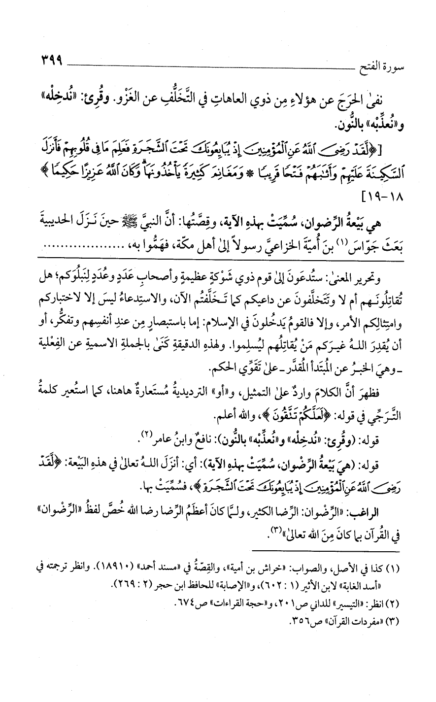 [{لَقَدْ رَضِيَ اللَّهُ عَنِ الْمُؤْمِنِينَ إِذْ يُبايِعُونَكَ تَحْتَ الشَّجَرَةِ فَعَلِمَ ما فِي قُلُوبِهِمْ فَأَنْزَلَ السَّكِينَةَ عَلَيْهِمْ وَأَثابَهُمْ فَتْحًا قَرِيبًا * وَمَغانِمَ كَثِيرَةً يَاخُذُونَها وَكانَ اللَّهُ عَزِيزًا حَكِيمًا} 18 - 19]