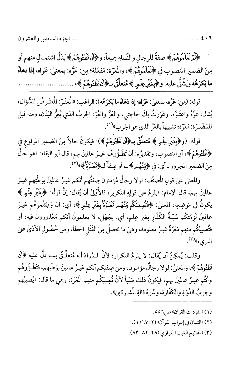 {لَمْ تَعْلَمُوهُمْ} صفة الرجال والنساء جميعًا، و {أَنْ تَطَؤُهُمْ} بدل اشتمال منهم أو من الضمير المنصوب في {تَعْلَمُوهُمْ}، والمعرة: مفعلة؛ من عره: بمعنى: عراه، إذا دهاه ما يكرهه ويشق عليه. و {بِغَيْرِ عِلْمٍ} متعلق بـ {أَنْ تَطَؤُوهُمْ}،