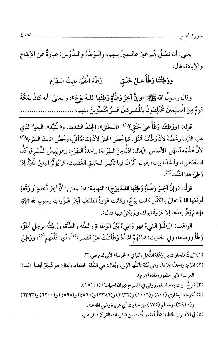 الراغب: "وطؤ الشيء فهو وطيء بين الوطاءة والطئة والطأة، ووطئته برجلي أطؤه وطأ ووطاءة، وفي الحديث: "اللهم اشدد وطأتك على مضر"، أي: ذللهم، ووطئ