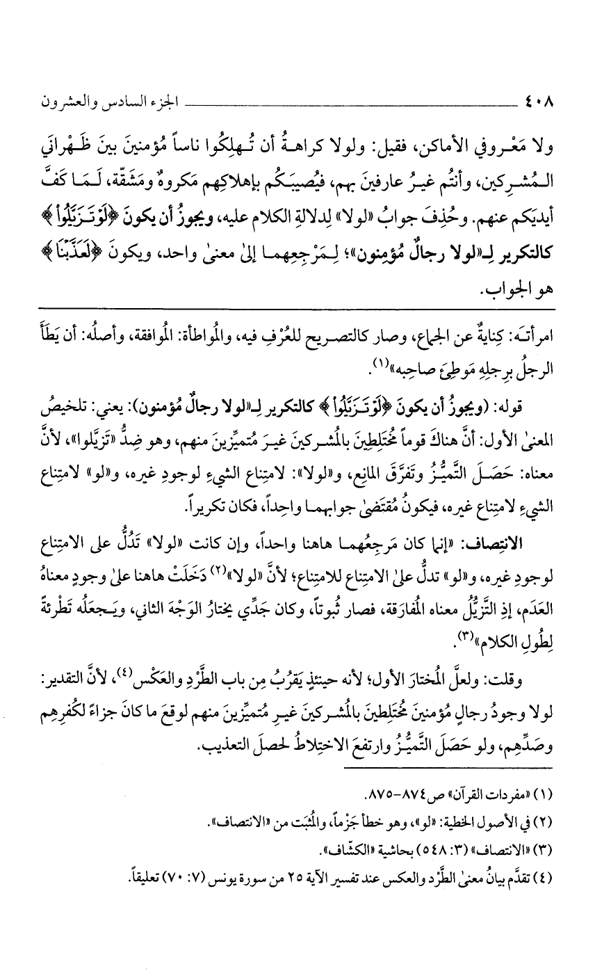 ولا معروفي الأماكن، فقيل: ولولا كراهة أن تهلكوا ناسًا مؤمنين بين ظهراني المشركين، وأنتم غير عارفين بهم، فتصيبكم بإهلاكهم مكروه ومشقة، لما كف أيديكم عنهم. وحذف جواب «لولا» لدلالة الكلام عليه، ويجوز أن يكون {لَوْ تَزَيَّلُوا} كالتكرير لـ"لولا رجال مؤمنون"؛ لمرجعهما إلى معنى واحد، ويكون {لَعَذَّبْنَا} هو الجواب.