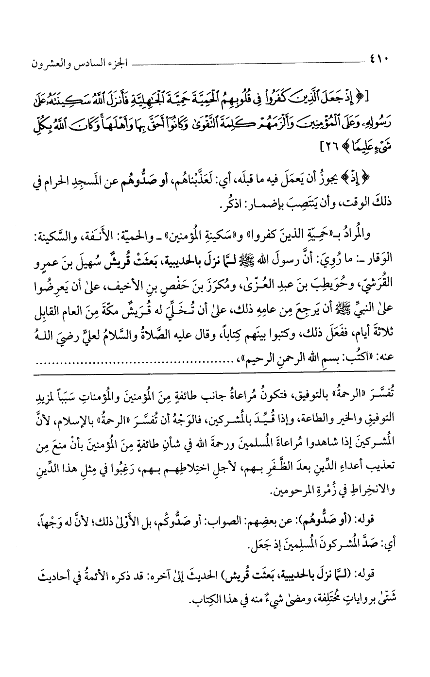 والمراد بـ"حمية الذين كفروا" و"سكينة المؤمنين" -والحمية: الأنفة، والسكينة: الوقار-: ما روي: أنّ رسول الله صلى الله عليه وسلم لما نزل بالحديبية، بعثت قريش سهيل بن عمرو القرشي، وحويطب بن عبد العزى، ومكرز بن حفص بن الأخيف، على أن يعرضوا على النبي صلى الله عليه وسلم أن يرجع من عامه ذلك، على أن تخلي له قريش مكة من العام القابل ثلاثة أيام، ففعل ذلك، وكتبوا بينهم كتابًا، فقال عليه الصلاة والسلام لعلي رضي الله عنه: "اكتب بسم الله الرحمن الرحيم"،