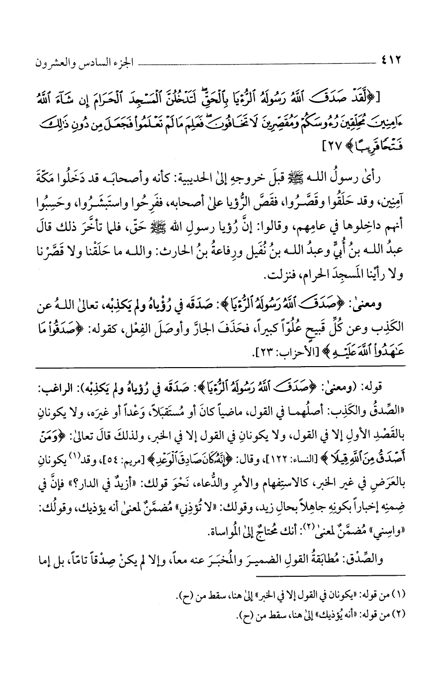 قوله: (ومعنى: {صَدَقَ اللَّهُ رَسُولَهُ الرُّؤْيَا}: صدقة في رؤياه ولم يكذبه): الراغب: "الصدق ولا كذب: أصلهما في القول، ماضيًا كان أو مستقبلًا، وعدًا أو غيره، ولا يكونان بالقصد الأول إلا في القول، ولا يكونان في القول إلا في الخبر، ولذلك قال تعالى: {وَمَنْ أَصْدَقُ مِنَ اللَّهِ قِيلًا} [النساء: 122]، وقال: {إِنَّهُ كَانَ صَادِقَ الْوَعْدِ} [مريم: 54]، وقد يكونان بالعرض في غير الخبر، كالاستفهام والأمر والدعاء، نحو قولك: "أزيد في الدار؟ " فإن في ضمنه إخبارًا بكونه جاهلًا بحال زيد، وقولك: "لا تؤذني" مضمن لمعنى أنه يؤذيك، وقولك: "واسني" مضمن لمعنى: أنك محتاج إلى المواساة.