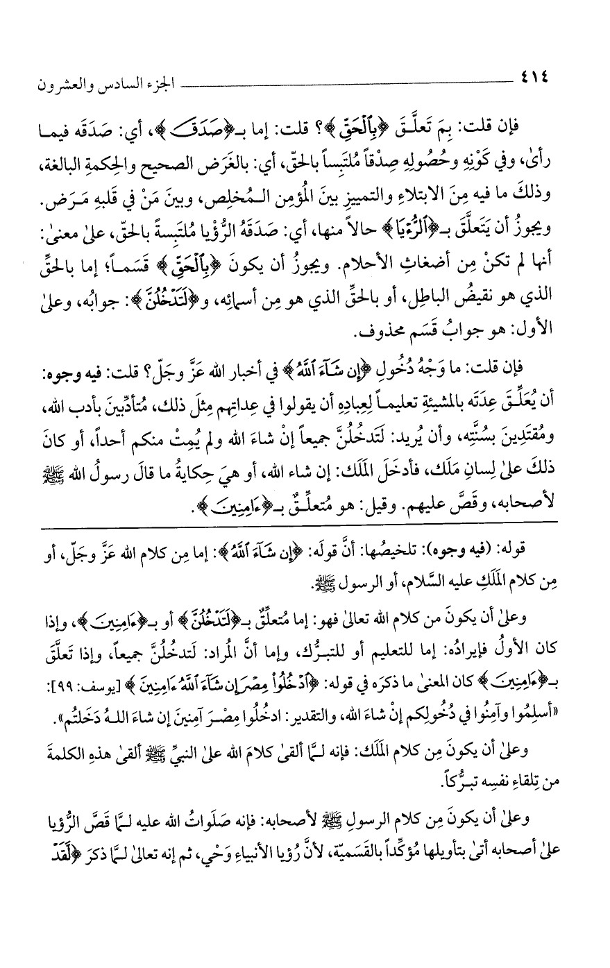 فإن قلت: بم تعلق {بِالْحَقِّ}؟ قلت: إمّا بـ {صَدَقَ}، أي: صدقه فيما رأى، وفي كونه وحصوله صدقًا ملتبسًا بالحق، أي: بالغرض الصحيح والحكمة البالغة، وذلك ما فيه من الابتلاء والتمييز بين المؤمن المخلص، وبين من في قلبه مرض. ويجوز أن يتعلق بـ {الرُّؤْيَا} حالًا منها، أي: صدقه الرؤيا ملتبسًا بالحق، على معنى: أنها لم تكن من أضغاث الأحلام. ويجوز أن يكون {بِالْحَقِّ} قسمًا؛ إمّا بالحق الذي هو نقيض الباطل، أو بالحق الذي هو من أسمائه، و {لَتَدْخُلُنَّ}: جوابه، وعلى الأوّل: هو جواب قسم محذوف.