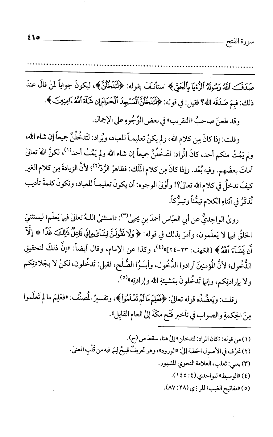روى الواحدي عن أبي العباس أحمد بن حيي: "استثنى الله تعالى فيما يعلم؛ ليستثني الخلق فيما لا يعلمون، وأمر بذلك في قوله: {وَلَا تَقُولَنَّ لِشَيْءٍ إِنِّي فَاعِلٌ ذَلِكَ غَدًا * إِلَّا أَنْ يَشَاءَ اللَّهُ} [الكهف: 23 - 24] "، وكذا عن الإمام، وقال أيضًا: "عن ذلك لتحقيق الدخول؛ لأن المؤمنين أرادوا الدخول، وأبوا الصلح، فقيل: تدخلون، لكن لأا بجلادتكم ولا بإرادتكم، وإنما تدخلون بمشيئة الله وإرادته".