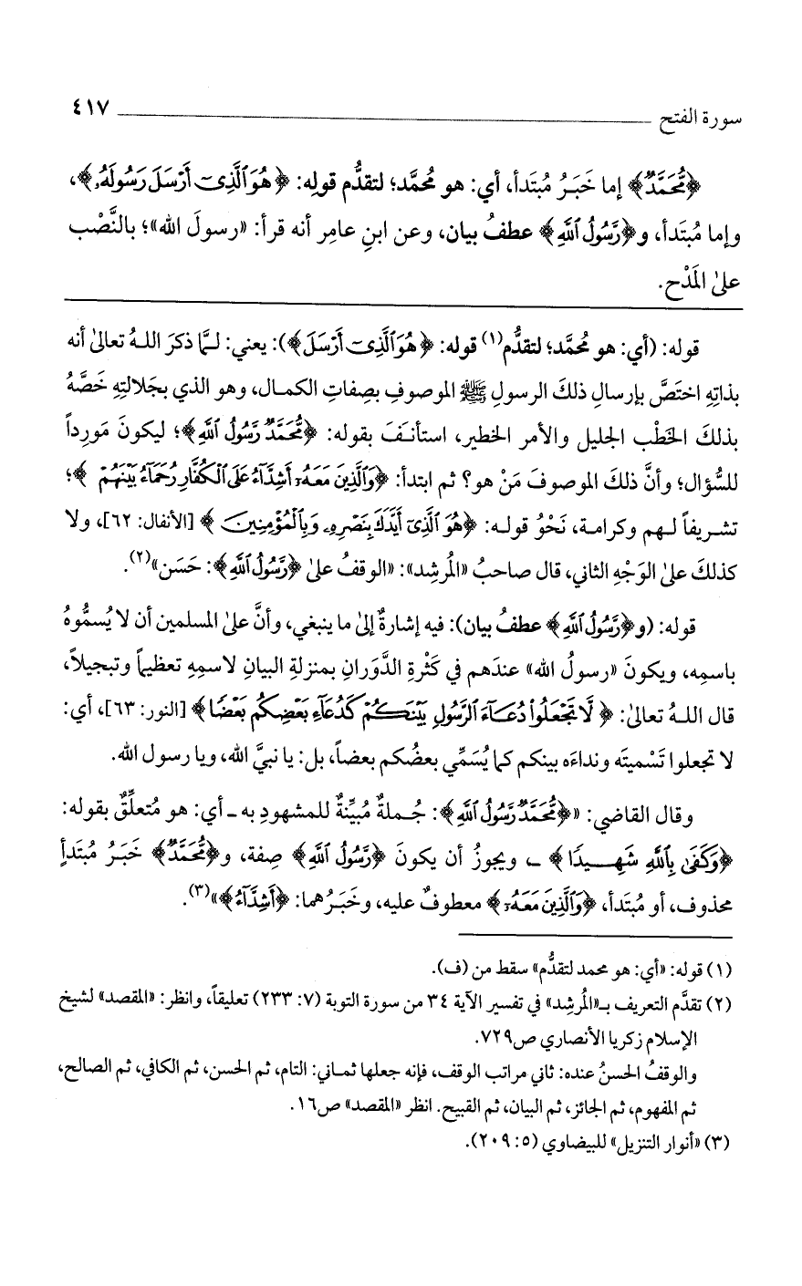 قوله: (و {رَّسُولُ اللَّهِ} عطف بيان): فيه إشارة إلى ما ينبغي، وأن على المسلمين أن لا يسموه باسمه، ويكون" رسول الله" عندهم في كثرة الدوران بمنزلة البيان لا سمه تعظيمًا وتبجيلًا، قال الله تعالى: {لَا تَجْعَلُوا دُعَاءَ الرَّسُولِ بَيْنَكُمْ كَدُعَاءِ بَعْضِكُمْ بَعْضًا} [النور: 63]، أي: لا تجعلوا تسميته ونداءه بينكم يسمي بعضكم بعضًا، بل يا نبي الله، ويا رسول الله.