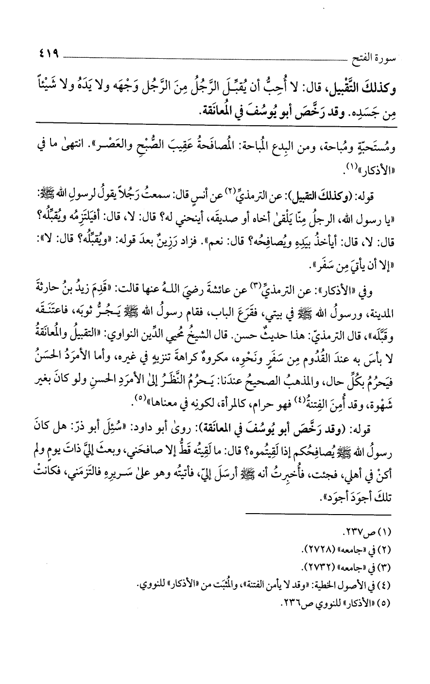 وفي "الأذكار": عن الترمذي عن عائشة رضي الله عنها قالت: "قدم زيد بن حارثة المدينة، ورسول الله صلى الله عليه وسلم في بيتي، فقرع الباب، فقام رسول الله صلى الله عليه وسلم يجر ثوبه، فاعتنقه وقبله"، قال الترمذي: هذا حديث حسن. قال الشيخ محيي الدين النواوي: "التقبيل والمعانقة لا بأس به عند القدوم من سفر ونحوه، مكروه كراهة تنزيه في غيره، وأما الامرد الحسن فيحرم بكل حال، والمذهب الصحيح عندنا: يحرم النظر إلى الأمرد الحسن ولو كان بغير شهودة، وقد أمن الفتنه فهو حرام، كالمرة، لكونه في معناها".
