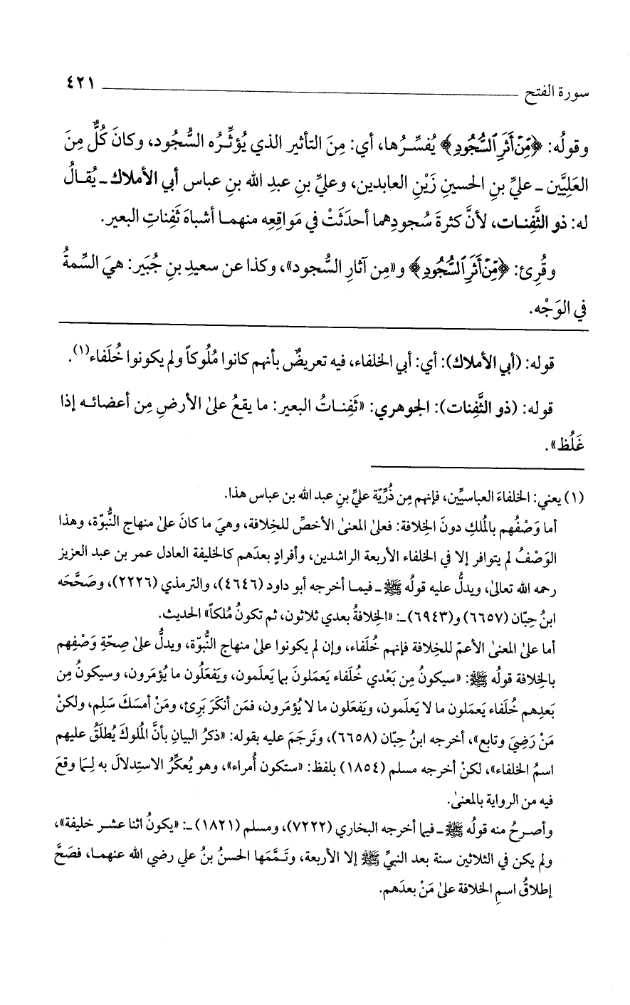 وقوله: {مِنْ أَثَرِ السُّجُودِ} يفسرها، أي: من التأثير الذي يؤثره السجود، وكان كل من العليين -عليّ بن الحسين زين العابدين، وعليّ بن عبد الله بن عباس أبي الأملاك- يقال له: ذو الثفنات، لأنّ كثرة سجودهما أحدثت في مواقعه منهما أشباه ثفنات البعير.
