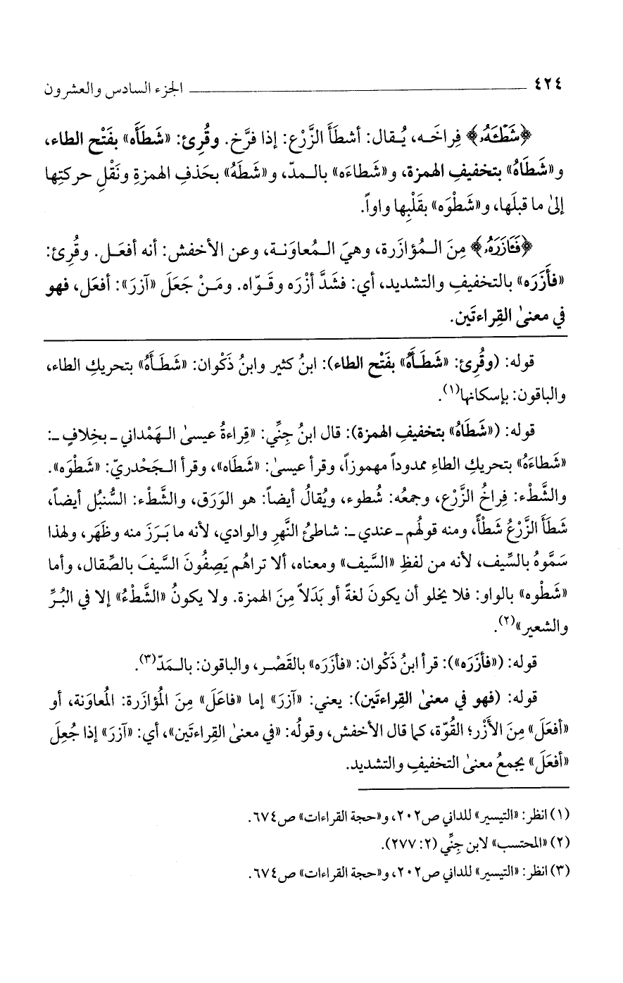 قوله: ("شطاه" بتخفيف الهمزة): قال ابن جني: "قراءة عيسى الهمداني_ بخلاف_: "شطاءه" بتحريك الطاء ممدودًا مهموزًا، وقرأ عيسى: "شطاه"، وقرأ الجحدري: "شطوه".